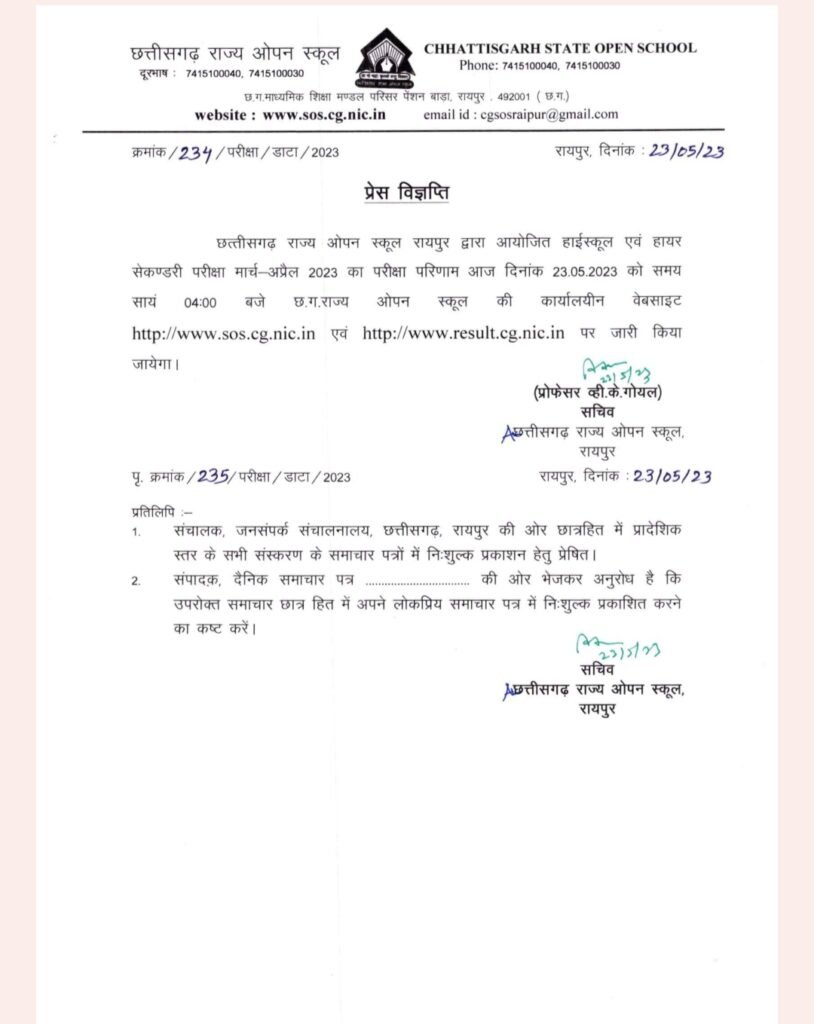 छत्तीसगढ़: बोर्ड ऑफ ओपेन स्कूल, रायपुर द्वारा आज यानी 23 मई 2023 दिन मंगलवार को दसवीं और बारहवीं के नतीजे (CGSOS Class 10th & 12th Results 2023) घोषित किए जाएंगे. बोर्ड (CGSOS) द्वारा दी जानकारी के अनुसार रिजल्ट (CGSOS Results 2023) आज शाम 4 बजे जारी किए जाएंगे. वे कैंडिडेट्स जिन्होंने छत्तीसगढ़ बोर्ड ओपेन स्कूल की 10वीं और 12वीं की परीक्षा दिए हो, वे आधिकारिक वेबसाइट से रिजल्ट चेक कर सकते हैं. ऐसा करने के लिए इन दो वेबसाइट्स का इस्तेमाल किया जा सकता है। – sos.cg.nic.in, result.cg.nic.in