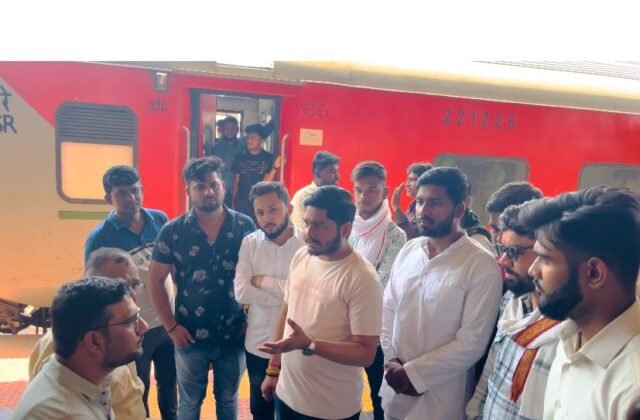 NSUI का प्रदर्शन लगातार ट्रेनों के रद्द होने से यात्री परेशान NSUI प्रदेश अध्यक्ष के नेतृत्व में परेशान यात्रियों से संवाद करने पहुंचे एनएसयूआई कार्यकर्ता