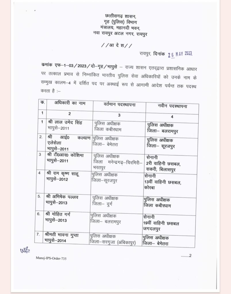 एसपी अभिषेक पल्लव का दुर्ग से कवर्धा ट्रांसफर।