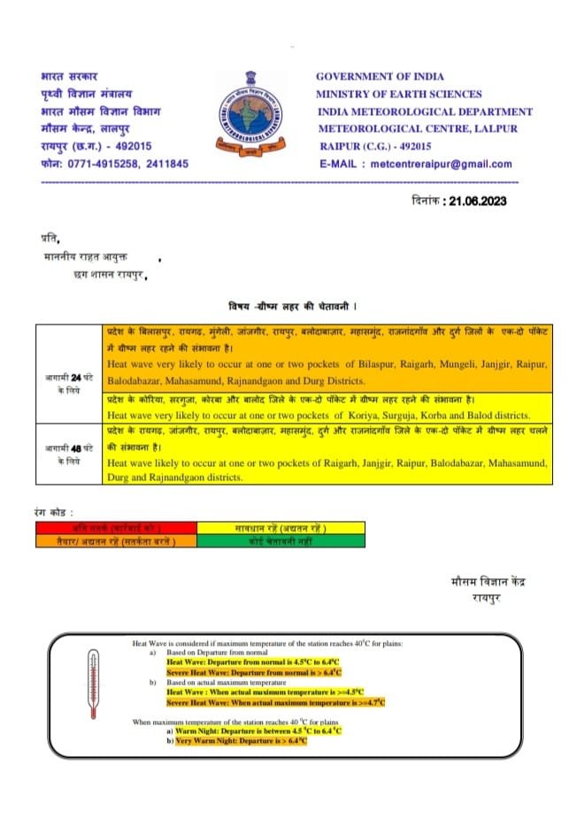 24 घंटे के लिए जारी किए गए आरेंज अलर्ट में प्रदेश के बिलासपुर रायगढ़ मुंगेली जांजगीर रायपुर बलोदा बाजार महासमुंद राजनादगांव और दुर्ग जिले के एक-दो स्थानों पर लू चलने की संभावना24 घंटे के लिए जारी किए गए।