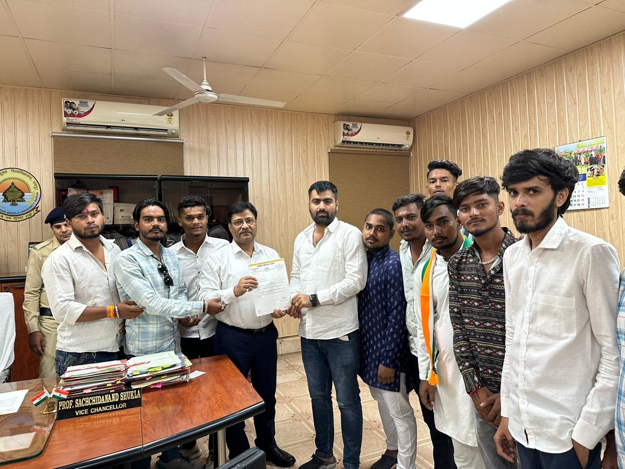 छत्तीसगढ़ : एनएसयूआई द्वारा आज पंडित रविशंकर विश्वविद्यालय में राष्ट्रीय संयोजक हनी बग्गा के नेतृत्व में कुलपति को ज्ञापन सौंपा आज प्रधानमंत्री नरेंद्र मोदी का कार्यक्रम साइंस कॉलेज मैदान में रखा गया था इस कार्यक्रम के दौरान पंडित रविशंकर विश्वविद्यालय में भारतीय जनता पार्टी का झंडा विश्वविद्यालय परिसर में लगाया गया इसको लेकर आज एनएसयूआई के नेता हनी बग्गा के नेतृत्व में एक प्रतिनिधिमंडल विश्वविद्यालय के कुलपति को ज्ञापन सौंपा इस ज्ञापन में एनएसयूआई ने बीजेपी का झंडा लगने पर अपना विरोध दर्ज कराया और ज्ञापन में कहा जिस प्रकार विश्वविद्यालय परिसर में बीजेपी का झंडा लगाया गया इसका हम विरोध करते हैं और बीजेपी पर कार्यवाही की मांग करते हैं यदि विश्वविद्यालय बीजेपी पर उचित कार्यवाही ना करें तो एनएसयूआई को लिखित रूप से यह सूचना देगी आने वाले समय में कांग्रेस के नेता जो संविधानिक पद पर बैठे हैं जब वह विश्वविद्यालय परिसर में आए तब हम कांग्रेस पार्टी का झंडा विश्वविद्यालय परिसर में लगाएं इस बात को कहते हुए उन्होंने कुलपति से लिखित रूप से इसकी मांग की।।