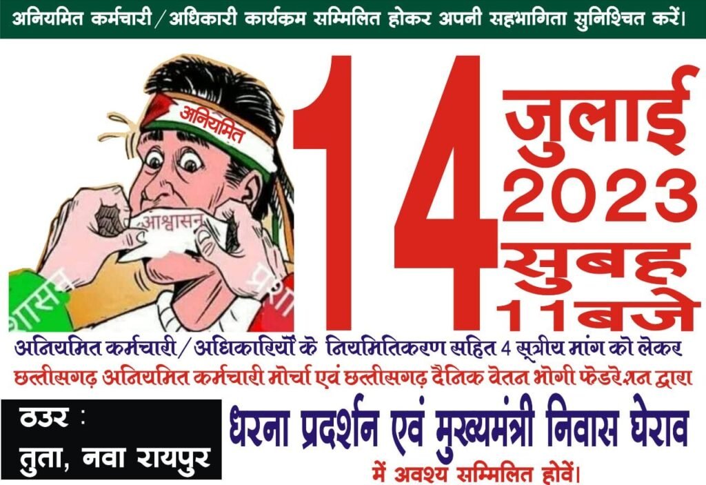 रायपुर: गोपाल प्रसाद साहू प्रांतीय संयोजक छत्तीसगढ़ अनियमित कर्मचारी मोर्चा ने कहा कि प्रदेश में कार्यरत अनियमित कर्मचारियों [संविदा, दैनिक वेतन भोगी, कलेक्टर दर, श्रमायुक्त दर पर कार्यरत श्रमिक, प्लेसमेंट, मानदेय, अशंकालिक, जाबदर, ठेका] अपने नियमितीकरण सहित 4 सूत्रीय मांगों को लेकर “छत्तीसगढ़ अनियमित कर्मचारी मोर्चा एवं छत्तीसगढ़ दैनिक वेतन भोगी कर्मचारी फेडरेशन” के संयुक्त तत्वावधान में 14 जुलाई 23 को धरना-प्रदर्शन कर रहा है एवं 3 बजे मुख्यमंत्री निवास घेराव के लिए निकलेगा |श्री रामकुमार सिन्हा प्रांतीय संयोजक छत्तीसगढ़ दैनिक वेतन भोगी कर्मचारी फेडरेशन ने बताया कि कांग्रेस ने अपने “जन-घोषणा-पत्र” के बिंदु क्रमांक 11 एवं 30 में अनियमित, संविदा एवं दैनिक वेतन भोगी कर्मचारियों को नियमित करने, छटनी न करने तथा आउट सोर्सिंग बंद करने का वादा किया है| अनियमित मंच से 14.02.2019 को माननीय मुख्यमंत्री ने स्वयं वचन दिए कि इस वर्ष किसानों लिए है आगामी वर्ष कर्मचारियों का होगा| अनियमित संघो के आवेदनों का परिक्षण करने कमेटी बनाई गई जो आज पर्यंत रिपोर्ट नहीं सौंप सकी है| अद्यतन लगभग साढ़े चार वर्ष उपरांत भी प्रदेश के अनियमित कर्मचारी (संविदा, दैनिक वेतन भोगी/कलेक्टर दर/श्रमायुक्त दर पर कार्यरत श्रमिक, प्लेसमेंट (आउटसोर्सिंग) / मानदेय, जॉबदर, अंशकालीन, ठेका) अनियमित ही है|राजेश गुप्ता एवं मनोज सोना द्वय ने कहा कि समस्यायों के निराकरण हेतु माननीय मुख्यमंत्री जी से मिलने अनेक प्रयास किये पर मुलाकात का समय नहीं दिया| सरकार द्वारा अनियमित कर्मचारियों के समस्याओं पर किसी प्रकार कार्यवाही नहीं होने से अनियमित कर्मचारी व्यथित एवं आक्रोशित है|श्री प्रेम प्रकाश गजेन्द्र सह संयोजक छत्तीसगढ़ अनियमित कर्मचारी मोर्चा ने बताया की प्रदेश के शासकीय 48 प्रशासनिक विभगों, 650 से अधिक शासकीय कार्यालयों (विभागों/निगम/मंडलों/स्वशासी निकाय) में 3 लाख से अधिक अनियमित कर्मचारी (संविदा-50000, दैनिक वेतन भोगी/कलेक्टर दर/श्रमायुक्त दर पर कार्यरत श्रमिक-31000, प्लेसमेंट-53000, मानदेय-86000, अशंकालिक-66000, जाबदर-10000, ठेका-30000 ) कार्यरत है| इसी प्रकार रसोइया-87000, आंगनबाड़ी/मिनी आंगनबाड़ी कार्यकर्ता-52000, आंगनबाड़ी सहायिका-46000, मितानिन/प्रशिक्षक-75000 भी कार्यरत है तथा 40000 अनियमित कर्मचारी पृथक है | (संख्या अनुमानित-जैसा विभाग में कार्यरत कर्मचारियों द्वारा बताया गया है) इसमें से 60 से अधिक सहयोगी संगठनों/विभाग के 1 लाख से अधिक कर्मचारियों का प्रतिनिधित्व मोर्चा/फेडरेशन करता है और आज 10 हजार से अधिक कर्मचारी इस धरना-प्रदर्शन एवं मुख्यमंत्री निवास घेराव में सम्मिलित होंगे|