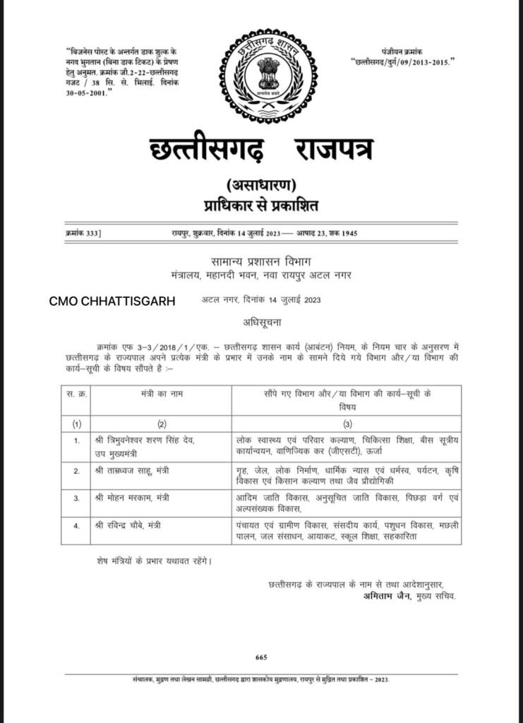 मंत्री रवींद्र चौबे को शिक्षा सहकारिता का अतिरिक्त प्रभार दिया गया।