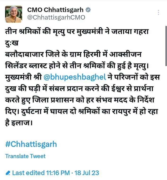 दुर्घटना में दो श्रमिक घायल हुए हैं जिन्हें उपचार के लिए रायपुर भेजा गया है। मुख्यमंत्री ने इनके शीघ्र स्वास्थ्य लाभ की कामना की है।