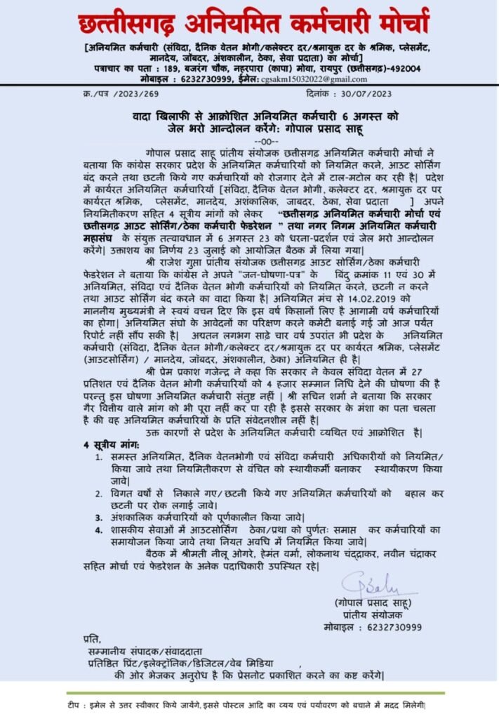 गोपाल प्रसाद साहू प्रांतीय संयोजक छत्तीसगढ़ अनियमित कर्मचारी मोर्चा ने बताया कि कांग्रेस सरकार प्रदेश के अनियमित कर्मचारियों को नियमित करने, आउट सोर्सिंग बंद करने तथा छटनी किये गए कर्मचारियों को रोजगार देने में टाल-मटोल कर रही है| प्रदेश में कार्यरत अनियमित कर्मचारियों [संविदा, दैनिक वेतन भोगी, कलेक्टर दर, श्रमायुक्त दर पर कार्यरत श्रमिक, प्लेसमेंट, मानदेय, अशंकालिक, जाबदर, ठेका, सेवा प्रदाता ] अपने नियमितीकरण सहित 4 सूत्रीय मांगों को लेकर “छत्तीसगढ़ अनियमित कर्मचारी मोर्चा एवं छत्तीसगढ़ आउट सोर्सिंग/ठेका कर्मचारी फेडरेशन” तथा नगर निगम अनियमित कर्मचारी महासंघ के संयुक्त तत्वावधान में 6 अगस्त 23 को धरना-प्रदर्शन एवं जेल भरो आन्दोलन करेंगे| उक्ताशय का निर्णय 23 जुलाई को आयोजित बैठक में लिया गया|श्री राजेश गुप्ता प्रांतीय संयोजक छत्तीसगढ़ आउट सोर्सिंग/ठेका कर्मचारी फेडरेशन ने बताया कि कांग्रेस ने अपने “जन-घोषणा-पत्र” के बिंदु क्रमांक 11 एवं 30 में अनियमित, संविदा एवं दैनिक वेतन भोगी कर्मचारियों को नियमित करने, छटनी न करने तथा आउट सोर्सिंग बंद करने का वादा किया है| अनियमित मंच से 14.02.2019 को माननीय मुख्यमंत्री ने स्वयं वचन दिए कि इस वर्ष किसानों लिए है आगामी वर्ष कर्मचारियों का होगा| अनियमित संघो के आवेदनों का परिक्षण करने कमेटी बनाई गई जो आज पर्यंत रिपोर्ट नहीं सौंप सकी है| अद्यतन लगभग साढ़े चार वर्ष उपरांत भी प्रदेश के अनियमित कर्मचारी (संविदा, दैनिक वेतन भोगी/कलेक्टर दर/श्रमायुक्त दर पर कार्यरत श्रमिक, प्लेसमेंट (आउटसोर्सिंग) / मानदेय, जॉबदर, अंशकालीन, ठेका) अनियमित ही है|श्री प्रेम प्रकाश गजेन्द्र ने कहा कि सरकार ने केवल संविदा वेतन में 27 प्रतिशत एवं दैनिक वेतन भोगी कर्मचारियों को 4 हजार सम्मान निधि देने की घोषणा की है परन्तु इस घोषणा अनियमित कर्मचारी संतुष्ट नहीं | श्री सचिन शर्मा ने बताया कि सरकार गैर वित्तीय वाले मांग को भी पूरा नहीं कर पा रही है इससे सरकार के मंशा का पता चलता है की वह अनियमित कर्मचारियों के प्रति संवेदनशील नहीं है|उक्त कारणों से प्रदेश के अनियमित कर्मचारी व्यथित एवं आक्रोशित है|