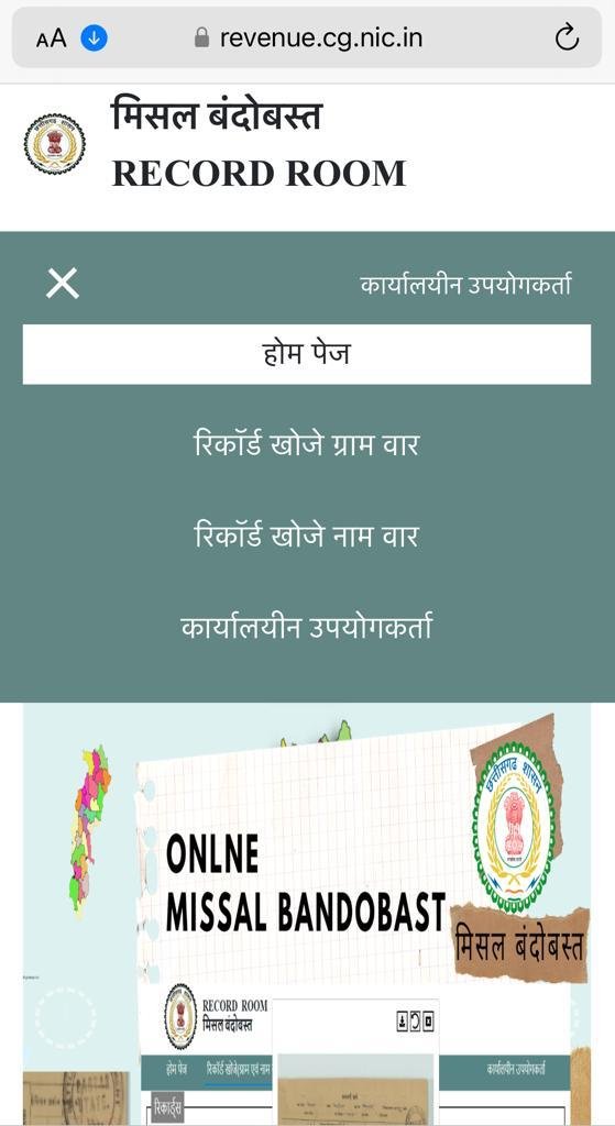 मोबाईल पर ऐसे मिलेंगे मिसल रिकार्ड- मिसल बंदोबस्त रिकार्ड पोर्टल का लिंक https:/revenue.cg.nic.in/missal/ है जिसमें प्रदान की गई व्यवस्था में रिकॉर्ड खोजे ग्राम वार एवं रिकॉर्ड खोजे नाम वार के माध्यम से सामान्य जन अपने कंप्यूटर या मोबाइल के माध्यम से वर्ष 1929-1945 के अपने रिकॉर्ड आसानी से प्राप्त कर सकते है। मिसल बंदोबस्त रिकार्ड ऑनलाइन चेक करने के लिए सबसे पहले आधिकारिक वेबसाइट https:/revenue.cg.nic.in/missal/ पर जाएँ। होम पेज पर आपको पूछी गयी जानकारियों जैसे- जिला, तहसील, राजस्व नंबर, प.ह.नं, गांव, अभिलेख का चुनाव करें। सभी पूछी गयी जानकारियों को दर्ज कर के खोजें पर क्लिक कर दें। अब आपकी स्क्रीन पर मिसल बंदोबस्त रिकार्ड लिस्ट खुल जाती है। खुले हुए पेज में नाम ढूंढे और उसके आगे सलेक्ट लिखा होगा वहां क्लिक करें। लाभार्थी लिस्ट को डाउनलोड भी कर सकते हैं व प्रिंट के ऑप्शन पर जा कर प्रिंटआउट भी निकाल सकते हैं।
