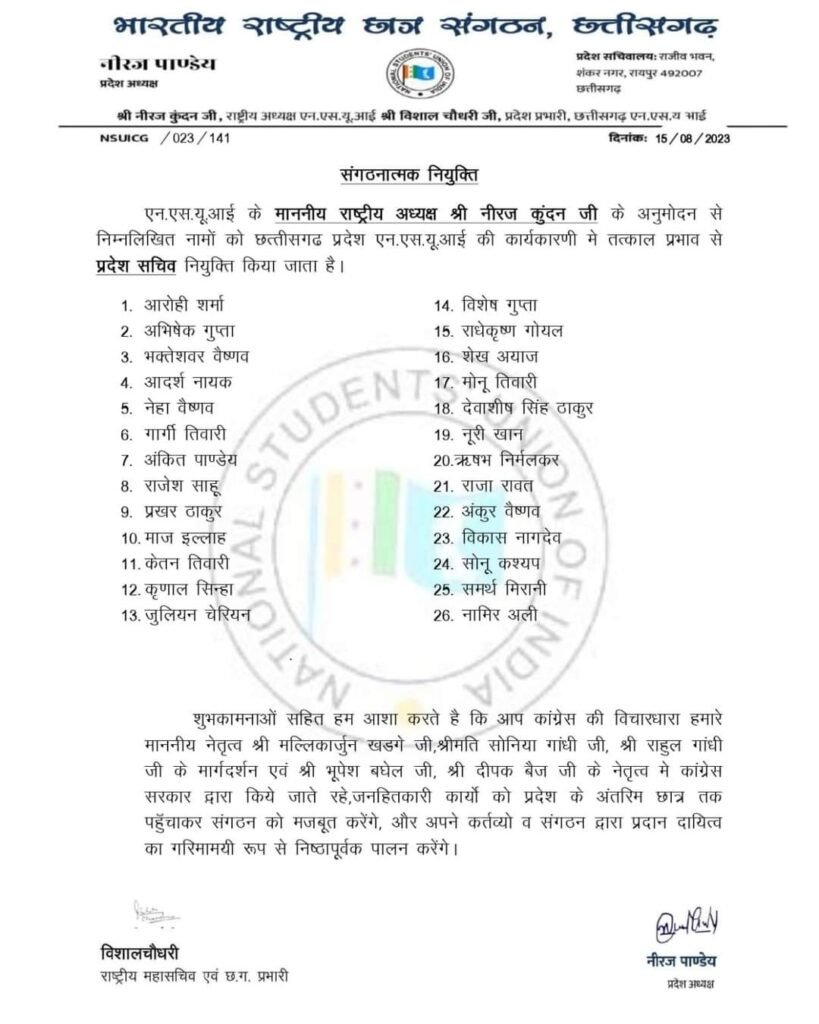 रायपुर:छात्रों की समस्याओं और सुविधाओं के लिए हमेशा तत्पर रहने वाले छात्र संगठन NSUI ने हाल ही में प्रदेश कार्यकारिणी का विस्तार कर छात्र नेताओं का नियुक्ति किया जिसमें रायपुर के बहुचर्चित छात्र नेता भक्तेश्वर वैष्णव को प्रदेश सचिव के तौर पर संगठन ने जिम्मेदारी दी है