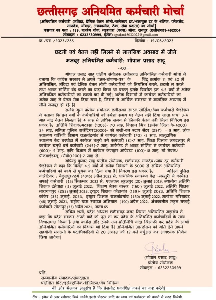 विवरण इस प्रकार है; महिला पुलिस वालेंटियर : बैकुंठपुर/दुर्ग (4045) अप्रैल 2022 से, प्राथमिक स्वास्थ्य केंद्र -मस्तुरी में कार्यरत सफाई कर्मचारी (15) सितम्बर 2022 से, एएनएम सूरजपुर (20) जुलाई 2019, स्थानीय अतिथि शिक्षक दंतेवाडा (2) जुलाई 2022, शिक्षण सेवक बस्तर (160) जुलाई 2022, अतिथि शिक्षक नारायणपुर (255) जुलाई 2023, ट्यूटर शिक्षक कोंडागांव (159)- जुलाई 2023, अतिथि शिक्षक कांकेर (35) जुलाई, 2023, ट्यूटर शिक्षक राजनांदगांव (150) जुलाई 2022, मनरेगा गरियाबंद (48) जुलाई 2021, राष्ट्रीय ग्राम स्वराज अभियान (190) अप्रैल 2022, अंशकालीन स्कुल सफाई कर्मचारी सीतापुर (33) अप्रैल 2021, अन्य 65 सचिन शर्मा, प्रदेश अध्यक्ष छत्तीसगढ़ नगर निगम अनियमित महासंघ ने कहा कि प्रदेश सरकार अपने वादे को पूरा ना कर प्रदेश के अनियमित कर्मचारियों के साथ विश्वासघात किया है तथा कांग्रेस और उनके जन-प्रतिनिधि वादा खिलाफी कर प्रदेश के लाखों अनियमित कर्मचारियों का विश्वास खो दिया है| अनियमित आन्दोलन को गति देने अपने सहयोगी संगठनों के पदाधिकारियों से 20 अगस्त को 12 बजे वर्चुअल कर आवश्यक निर्णय लिया जावेगा|