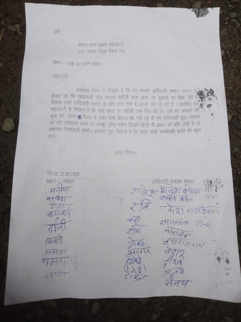 पूर्व आदिवासी महिला सरपंच केशरबाई ने बताया संबंधित विभाग द्वारा दिखावे की कार्यवाही की जाती है शराब माफिया कार्यवाही होने के तुरंत बाद वापस शराब विक्रय करना शुरू कर देते है उन्हे कानून का भय है ही नही हे। ज्ञापन देने के दौरान मनीषा बाई,सविता बाई,गंगा बाई, बसु बाई, ललता बाई,राकेश,रवि,गोलू,दिनेश,राहुलराजेश बघेला,शक्ति बघेला,राकेश नैगवेल,ज्ञान सिंह उईके,जयनारायण सोलंकी,केदार,दीपक,अजय एवं संजय सहित सैकड़ों आदिवासी युवा,महिला पुरुष शामिल थे।