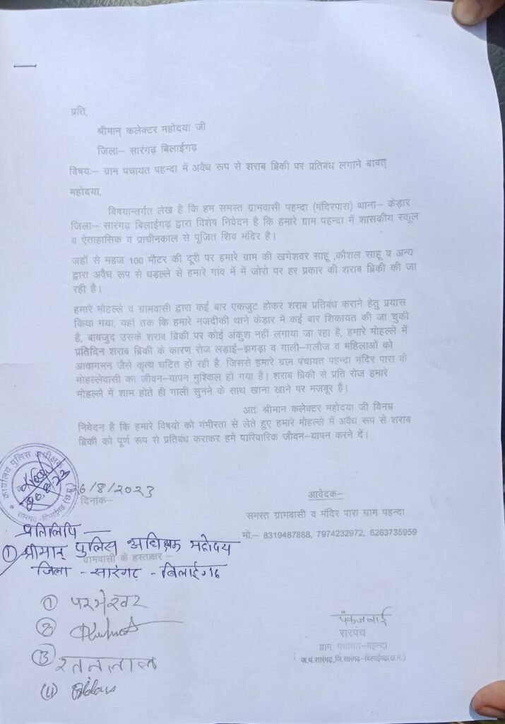 सारंगढ़ सारंगढ जिला मुख्यालय से महज 14 किलोमीटर समीप ग्राम पहंदा के 50 व्यक्ति आज दिनांक 26 अगस्त को कलेक्टर कार्यालय व पुलिस अधीक्षक के समक्ष लिखित ज्ञापन सौंपे है जिमसें गांव के कुछ रसूखदारो द्वारा गांव के स्कूल,मंदिर, व सार्वजनिक जगहों पर जोरों से शराब बिक्री कर रही है, जिसे प्रतिबंध लगाने के लिए ग्रामवासी एकजुट होकर गांव में पूर्ण शराब बंदी को लेकर आज ज्ञापन दिए है.।