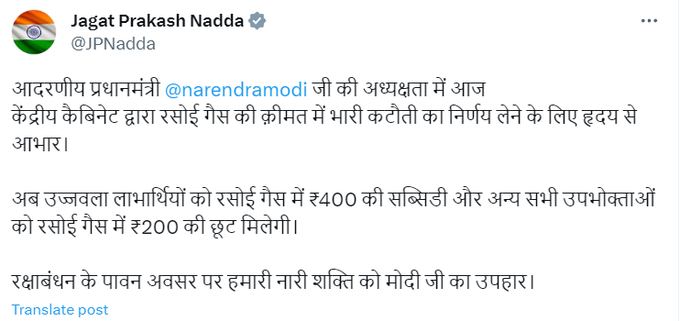 एलपीजी सिलेंडर की कीमत में कटौती पर भाजपा अध्यक्ष जेपी नड्डा ने ट्वीट किया, “अब उज्जवला लाभार्थियों को रसोई गैस में 400 रुपये की सब्सिडी और अन्य सभी उपभोक्ताओं को रसोई गैस में 200 रुपये की छूट मिलेगी।”