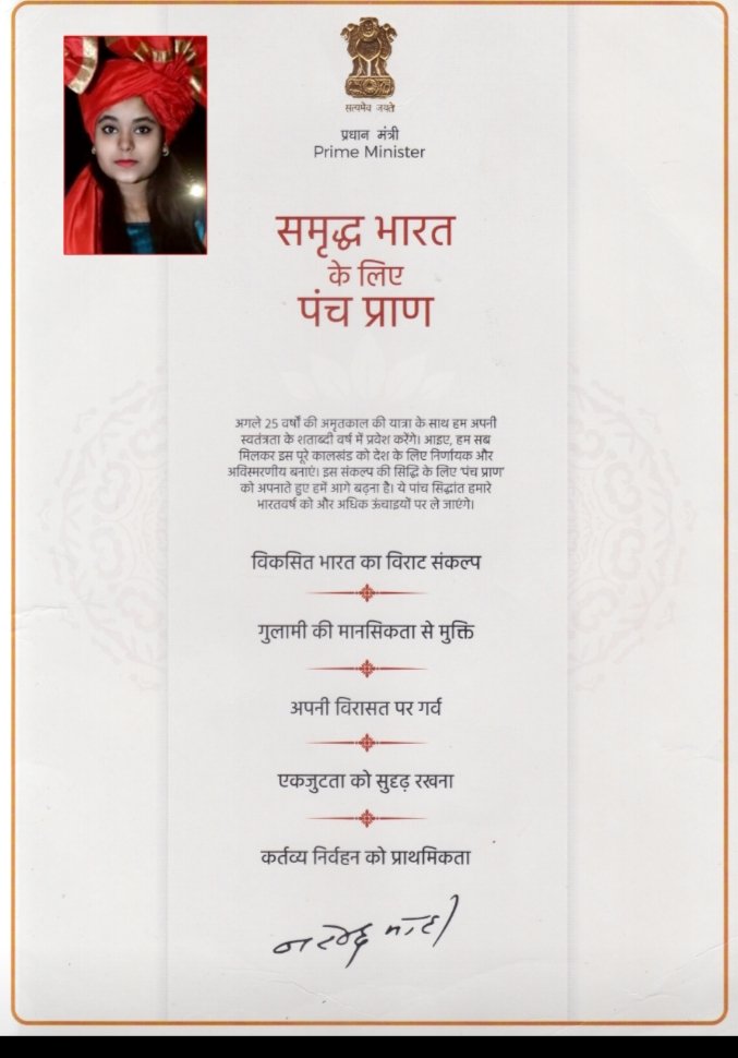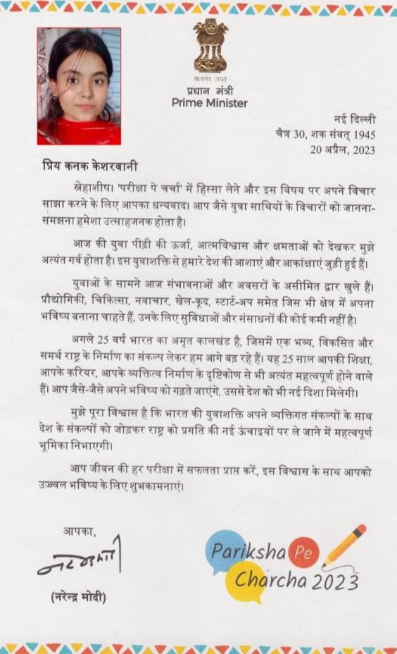 रायपुर:केसरवानी नगर सभा अध्यक्ष महेश श्रीमतीनंदा केसरवानी की पुत्री कनक केसरवानी जो 12वीं कॉमर्स में सेंचुरी सीमेंट में अध्यनरत है। विषय पर्यावरण समस्त जनरल नॉलेज इसमें पूरे भारत देश से 4 लाख बच्चों ने भाग लिया। जिसमें 2000 बच्चों का चयन हुआ। तिल्दा नेवरा में कनक केसरवानी का नाम प्रस्तावित हुआ। यह चयन देश के प्रधानमंत्री नरेंद्र मोदी द्वारा किया गया।डाक पत्र के माध्यम से कनक केसरवानी को यशस्वी प्रधानमंत्री नरेंद्र मोदी द्वारा बधाई सम्मान प्रमाण पत्र व उज्जवल भविष्य की शुभकामनाएं भेजी गई। लिखे की मेरे तरफ से उनके माता-पिता व परिवार को बधाई व समाज व तिल्दा शहर का नाम इसी तरह ऊंचा करते रहे इन्हीं शुभकामनाएं। के साथ सभी बच्चों को कनक से सीख लेकर अच्छी पढ़ाई उच्च शिक्षा का चयन करना चाहिए।