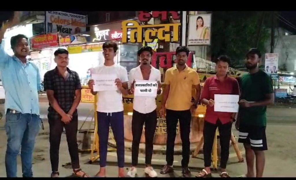 तिल्दा:मंदिर हसौद क्षेत्र में हुवे 10 युवकों के हैवानियत और दो माशुमो के साथ हुवे हृदय विदारक घटना ने पूरे प्रदेश को झकझोर कर रख दिया है पूरे प्रदेश में जहा अपराधियों को फांसी देने का मांग हो रहा है वही तिल्दा नेवरा के आदर्श युवा संघ के युवाओं ने तिल्दा दीनदयाल चौक पर कलंकित हैवानों को फांसी देने और बहनों को सम्मान देने की आवाज बुलंद किया चौक पर बलत्कारियो को फांशी दो करके नारे भी लगाया गया इस आक्रोश प्रदर्शन में राहुल वैष्णव,दमन साहू, अजय जांगड़े, रोहन , लक्की, संजय सेन सहित युवाजन मौजदु रहे।