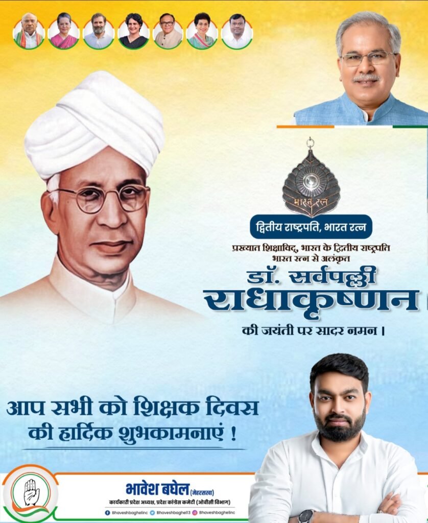 रायपुर: भारत में हर साल 5 सितंबर के दिन शिक्षक दिवस मनाया जाता है. इस दिन भारत के पूर्व राष्ट्रपति और शिक्षक डॉ. सर्वप्पली राधाकृष्णन के जन्म दिवस के रुप में मनाया जाता है।