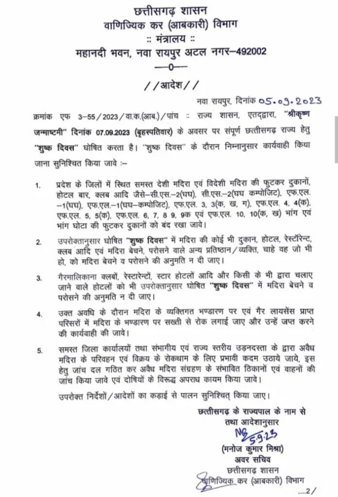 रायपुर: राज्य शासन द्वारा श्रीकृष्ण जन्माष्टमी पर 7 सितंबर को सम्पूर्ण छत्तीसगढ़ राज्य में ‘शुष्क दिवस‘ घोषित किया गया है। इस दौरान प्रदेश में स्थित समस्त देशी-विदेशी मदिरा की फुटकर दुकानें, होटल, बार, क्लब, भांग एवं भांग घोटा की फुटकर दुकानें बंद रहेंगी। इस अवधि के दौरान मदिरा के भण्डारण पर सख्ती से रोक लगाने, उड़नदस्तों द्वारा अवैध मदिरा के परिवहन एवं विक्रय की रोकथाम तथा दोषियों के विरूद्ध कठोर कार्यवाही करने के निर्देश आबकारी विभाग के अधिकारियोें को दिए गए हैं।