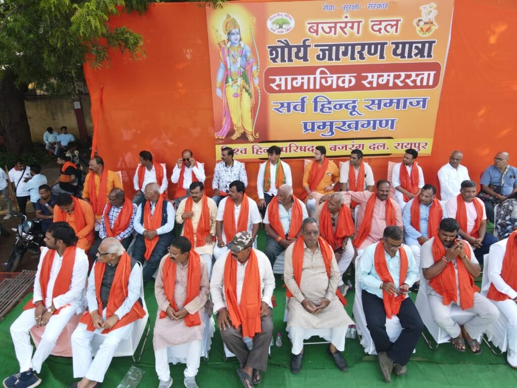 रायपुर:विश्व हिन्दू परिषद् की स्थापना को 60 वर्ष पूर्ण होने जा रहा है। इस निमित्त अयोध्या में भगवान राम के भव्य मंदिर निर्माण एवं अमर बलिदानी, क्रांतिकारी पराक्रम को लेकर सम्पूर्ण भारत में विश्व हिन्दू परिषद् बजरंग दल द्वारा शौर्य जागरण यात्रा निकाली जा रही है। भारत में राष्ट्र विरोधी, धर्म विरोधी शक्तियां संगठित होकर आतंकवाद, अलगाववाद, जातिवाद, लव जेहाद, लैंड जेहाद, विजनेस जेहाद, धर्मांतरण, गौ हत्या, ड्रग माफिया और जन संख्या असंतुलन जैसे अनेक प्रकार गतिविधियों से हिन्दू समाज पर आक्रमण कर हिन्दू समाज और देश को तोड़ने का षड़यंत्र रच रहे हैं। इन षड़यंत्रों के विरुद्ध जनजागरण की आवश्यकता को ध्यान में रखकर विश्व हिन्दू परिषद् बजरंग दल द्वारा शौर्य जागरण यात्रा का आयोजन सम्पूर्ण छत्तीसगढ़ में किया जा रहा है।महानगर रायपुर में भी आज 16 सितम्बर को शौर्य जागरण यात्रा सम्पन्न हुई। शौर्य जागरण यात्रा अंतर्गत दो यात्रायें BTI मैदान से निकाली गई। प्रथम यात्रा खम्हारडीह थाना, अवंति बाई मार्ग से तेलीबांधा तालाब से गांधी उद्यान से शंकरनगर होते हुए BTI मैदान पहुंची। दूसरी यात्रा लोधीपारा, पंडरी कपड़ा मार्केट चौक, राजा तालाब झण्डा चौक, न्यू शांति नगर से शंकर नगर होते हुए BTI मैदान पहुंची। दोनो यात्राएँ BTI मैदान में 3.00 बजे आम सभा में परिवर्तित हो गई