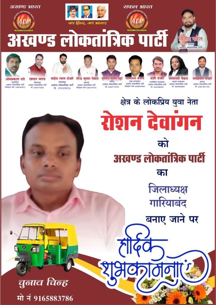 रोशन देवांगन ने बताया कि छत्तीसगढ़ में अखण्ड लोकतांत्रिक पार्टी ही एक ऐसी पार्टी है, जिसकी सरकार आने पर छत्तीसगढ़ के समस्त बेरोजगारों की बेरोजगारी दूर होगी।