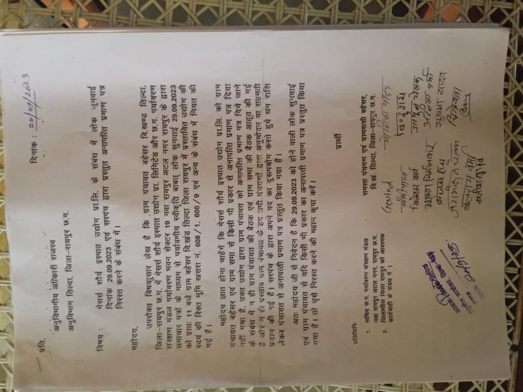 ग्रामीणों ने ज्ञापन में दर्शाया की ग्राम पंचायत बहेसर विकासखंड तिल्दा जिला रायपुर छत्तीसगढ़ मेंमर्स शौर्य इस्पात उद्योग प्रणाली लिमिटेड और छत्तीसगढ़ पर्यावरण संरक्षण मंडल पर्यावरण भवन सेक्टर 19 नया रायपुर अटल नगर के द्वारा समाचार पत्रों के माध्यम से पर्यावरण स्वीकृति बाबत लोक सनी 29 सितंबर को 11:00 बजे से ग्राम बहर विकासखंड तिल्दा जिला रायपुर में प्रस्तावित उद्योग की स्वयं की रिक्त भूमि खसरा नंबर 608/1 608/ 9 एवं अन्य के संबंध में नियत की गई है।