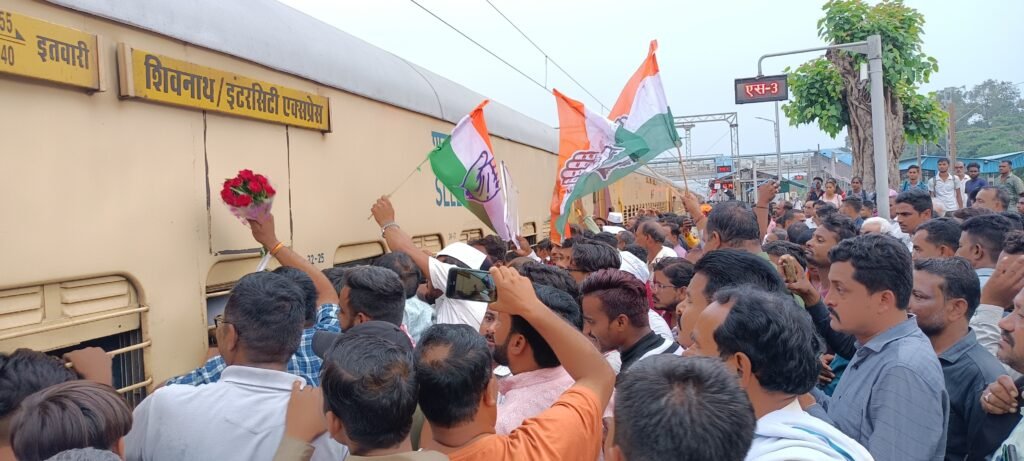 तिल्दा नेवरा रेल्वे स्टेशन में कांग्रेसी नेताओं के द्वारा ढोल नगाड़े बजाकर राहुल गांधी का स्वागत किया साथी राहुल गांधी भूपेश बघेल जिंदाबाद के नारे लगाए।