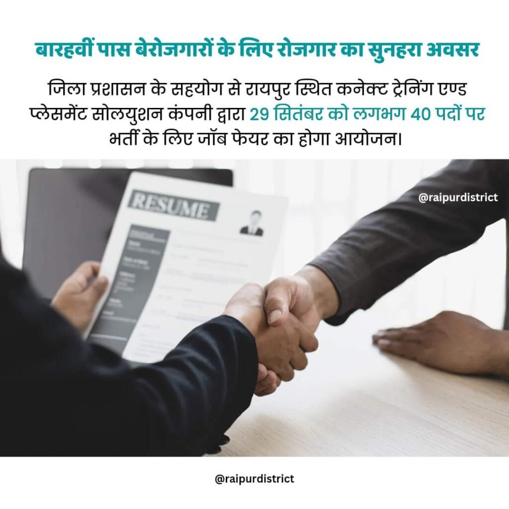 रायपुर:बारहवीं पास बेरोजगार युवक-युवतियों को दस हजार रूपये मासिक वेतन की नौकरी पाने का सुनहरा अवसर 29 सितम्बर को मिल रहा है। जिला प्रशासन के सहयोग से रायपुर स्थित कनेक्ट ट्रेनिंग एण्ड प्लेसमेंट सोलयुशन कंपनी द्वारा लगभग 40 पदों पर भर्ती के लिए जाॅब फेयर का आयोजन किया जा रहा है।