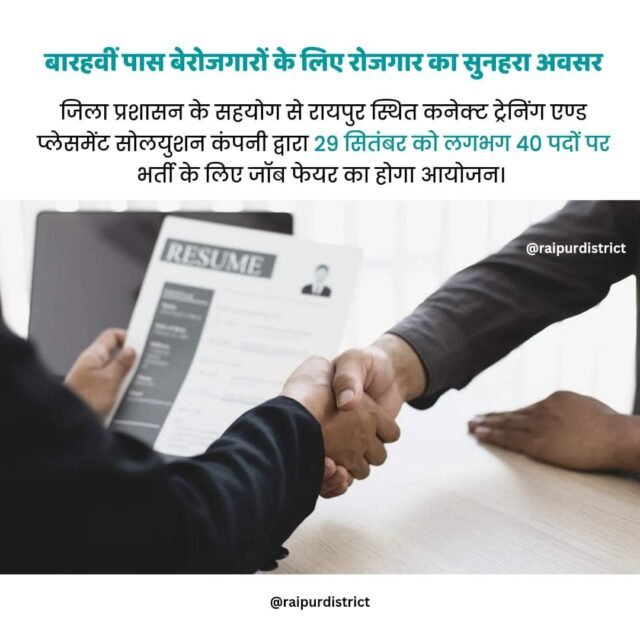 29 सितम्बर 2023 को सुबह 11 बजे से यह जाॅब फेयर रोजगार कार्यालय, पुराना पुलिस मुख्यालय परिसर रायपुर में आयोजित होगा।