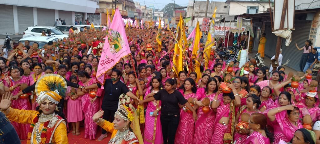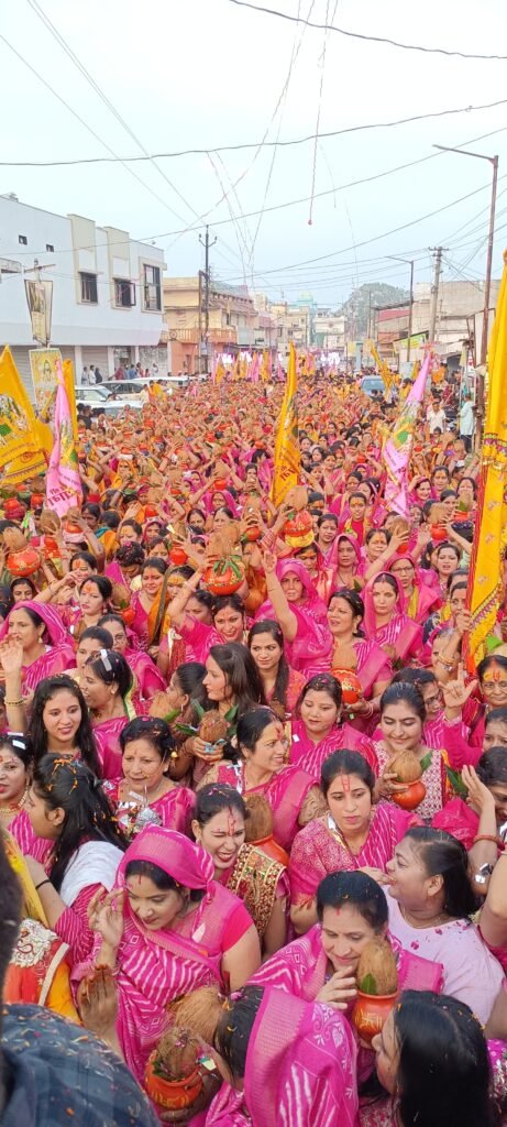 1008 श्री मद भागवत कथा पुराण का भव्य कलश यात्रा भक्ति में थिरकते भक्त राधे राधे की जयघोष के साथ किए नगर भ्रमण