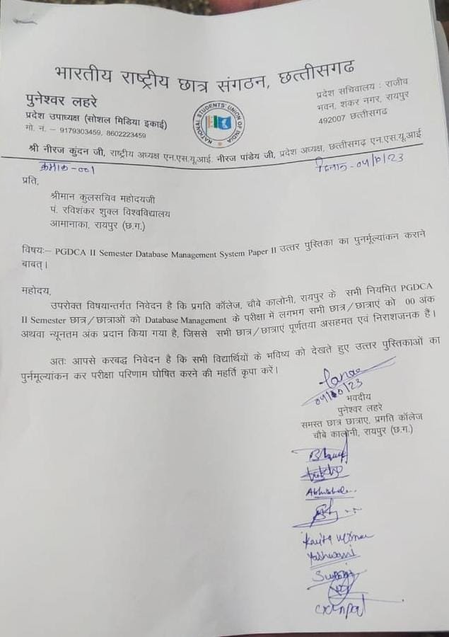 रायपुर:एनएसयूआई के वाइस चेयरमैन पुनेश्वर लहरे के नेतृत्व में प्रगति कॉलेज PGDCA ii Semester के सभी नियमित छात्र/छात्राओं को Database Management की परीक्षा में 00 अंक अथवा न्यूनतम अंक प्रदान किया गया है जिससे सभी छात्र / छात्राएं पूर्णतया असहमत एवं निराशजनक है। जिसके विरोध में एनएसयूआई कार्यकर्ता एवं छात्र-छात्राओं ने प्रशासनिक भवन पहुंच कर कुलसचिव को ज्ञापन सौंपा है ।पुनेश्वर लहरे ने कहा रविशंकर विश्वविद्यालय द्वारा लगातार प्रदेश के सभी अलग अलग कॉलेज में छात्रों को कई विषयों में शून्य अंक देकर छात्रों की भविष्य के साथ खिलवाड़ किया जा रहा है जिसके विरोध में कुलसचिव महोदय से पुर्नमूल्यांकन कर परीक्षा परिणाम घोषित करने का निवेदन किया गया ।