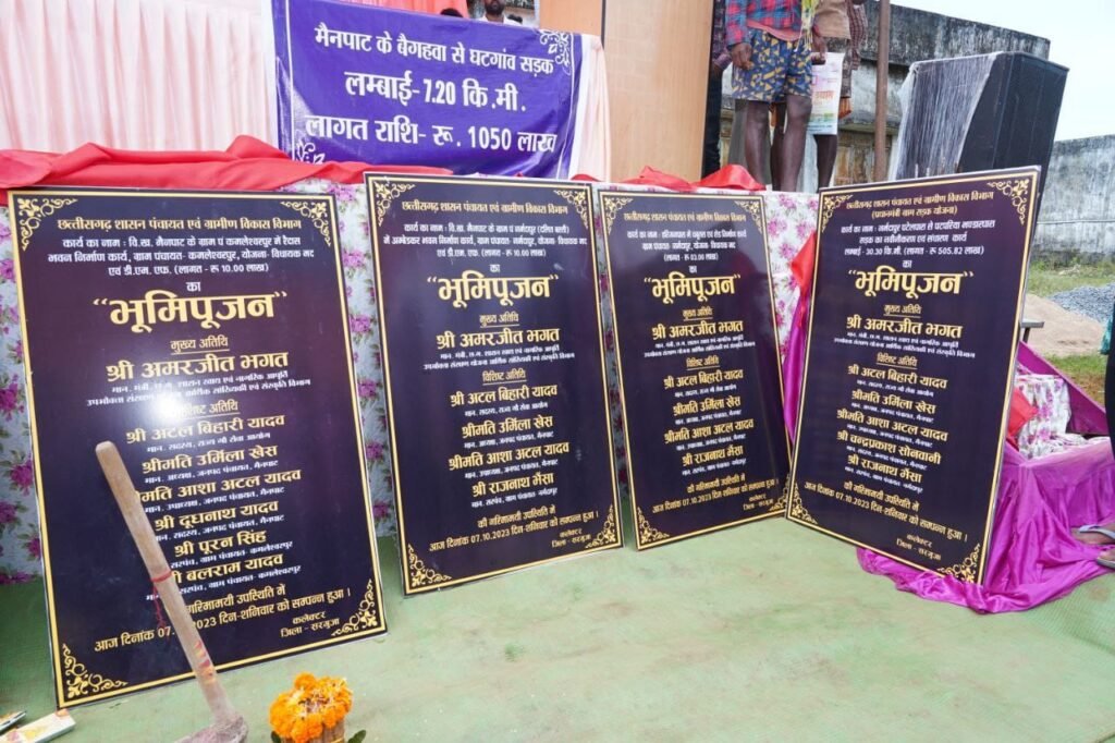 सीतापुर सरगुजा: दिनेश गुप्ता सड़क संधारण कार्य, सामुदायिक भवन निर्माण सहित विभिन्न निर्माण कार्य का भूमिपूजन भी शामिल छत्तीसगढ़ शासन के खाद्य एवं संस्कृति मंत्री अमरजीत भगत ने शनिवार को मैनपाट विकासखंड में सड़क एवं विभिन्न निर्माण कार्यों का भूमिपूजन किया। इस दौरान मंत्री भगत ने 10.50 करोड़ की लागत से मैनपाट के बैगहवा से घटगांव तक 7.20 किमी के सड़क निर्माण का भूमिपूजन किया।