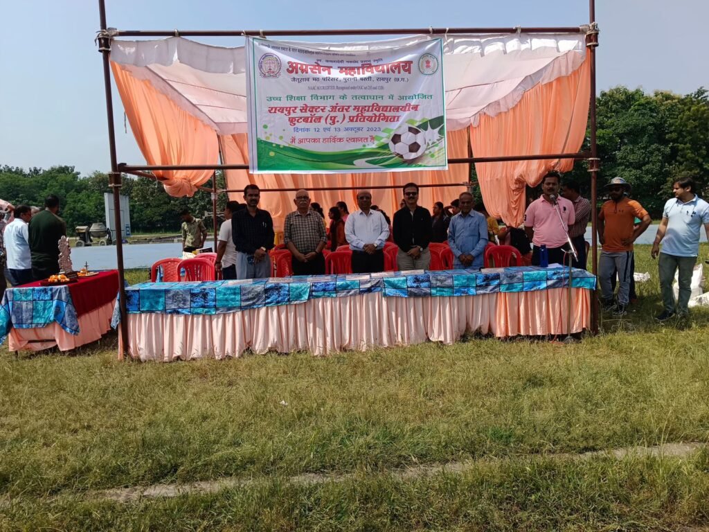 रायपुर : अग्रसेन महाविद्यालय और उच्च शिक्षा विभाग के संयुक्त तत्वावधान में सेक्टर स्तरीय (पुरुष वर्ग) फुटबॉल प्रतियोगिता पंडित रविशंकर शुक्ल विश्वविद्यालय के खेल मैदान में आज से शुरू हुई. आज के रोमांचक मुकाबलों में विप्र कॉलेज ने महंत कॉलेज को 4–0 से दुर्गा कॉलेज ने आरंग को 5– 0से यू टी डी ने कुरूद कॉलेज को 3 –0 से नेता जी अभनपुर ने हरिशंकर कॉलेज को 3–0 तथा साइंस कॉलेज ने 4–0 प्रगति कॉलेज को पराजित किया.उदघाटन समारोह में मुख्य अतिथि के रूप में पंडित रविशंकर शुक्ल विश्वविद्यालय के प्रबंध अध्ययन शाला के डायरेक्टर डॉ ए.के. श्रीवास्तव ने कहा कि पढ़ाई के साथ-साथ खेलकूद से शारीरिक और मानसिक विकास को नई दिशा मिलती है.