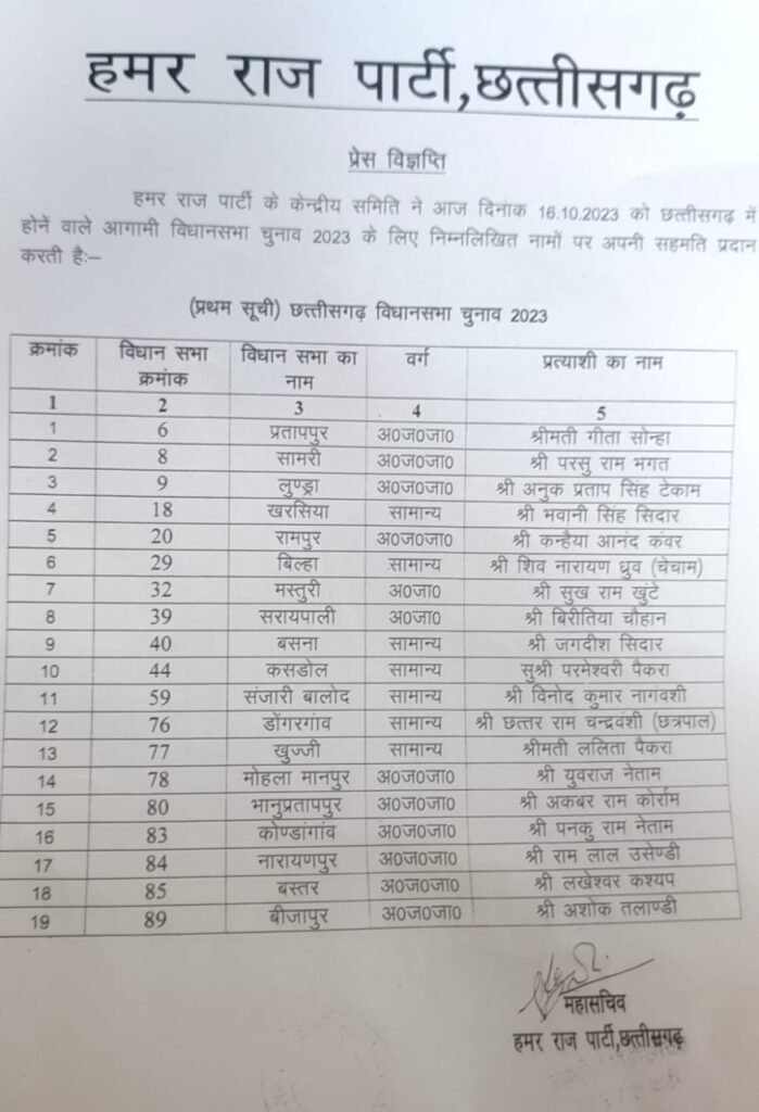 रायपुर ब्रेकिंग:हमर राज पार्टी, छत्तीसगढ़ ने घोषित की प्रत्याशी सर्व आदिवासी समाज का अंग है हमर राज पार्टी कार्यकारी अध्यक्ष बीएस रावटे ने दी जानकारी आदिवासी क्षेत्रों का विकास आदिवासियों के अनुरूप नहीं हो पाया इसलिए इस बार चुनाव मैदान उतरे हैं प्रथम सूची में 19 प्रत्याशियों के नाम