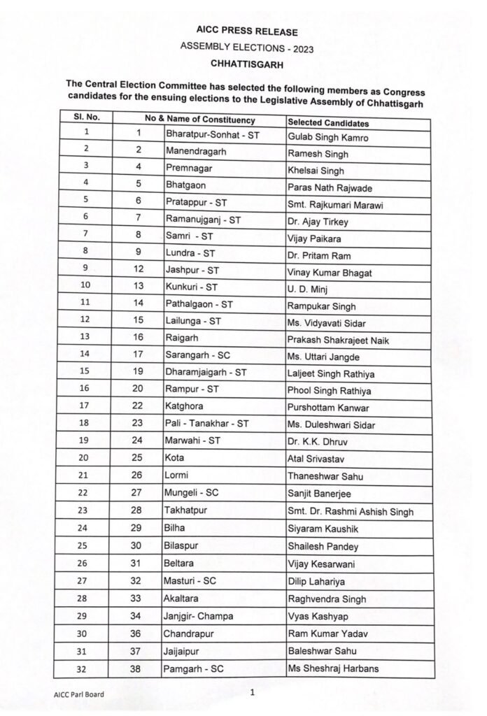 Home Politics 53 उम्मीदवारों की लिस्ट जारी,बलौदा बाजार से शैलेश नितिन,तो धरशिवा से छाया...