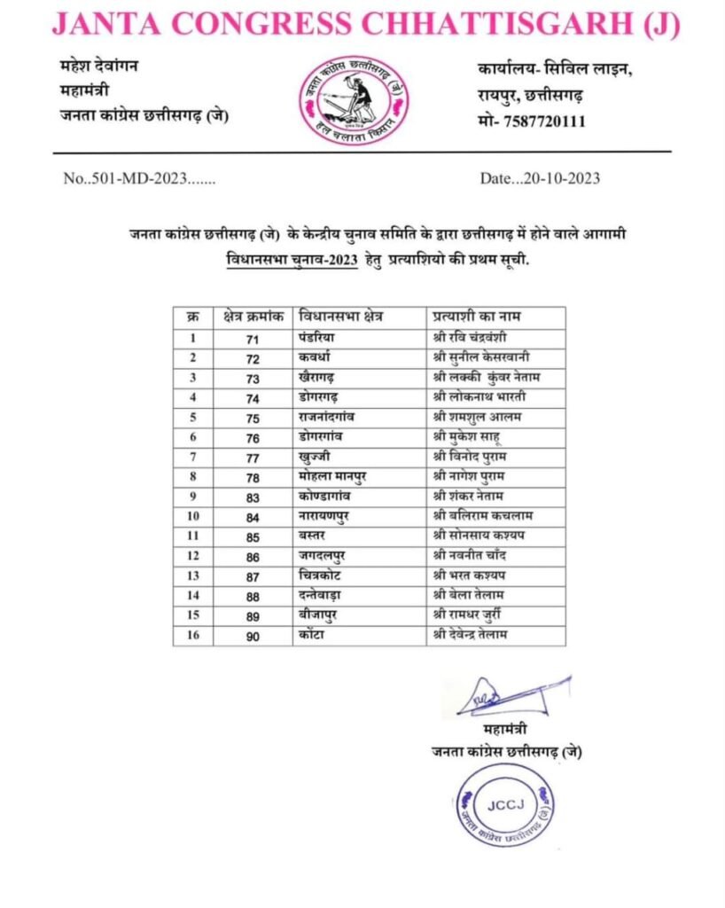 रायपुर ब्रेकिंग : जनता कांग्रेस छत्तीसगढ़ जोगी पार्टी ने जारी की विधानसभा प्रत्याशियों की पहली सूची.पहली सूची में 16 प्रत्याशियों को मैदान में उतारा. छत्तीसगढ़ में प्रथम चरण में होने वाले विधानसभा चुनाव के लिए जारी किए गए 16 प्रत्यशियों के नाम।