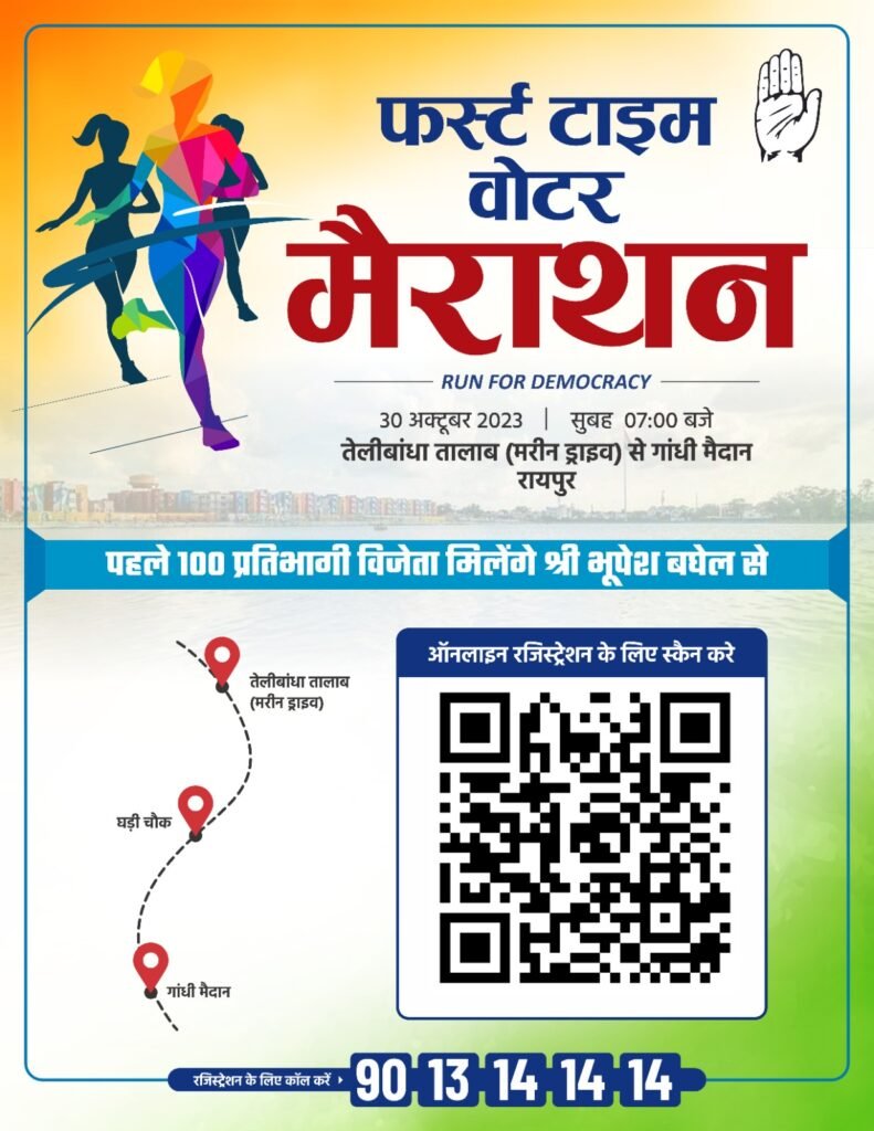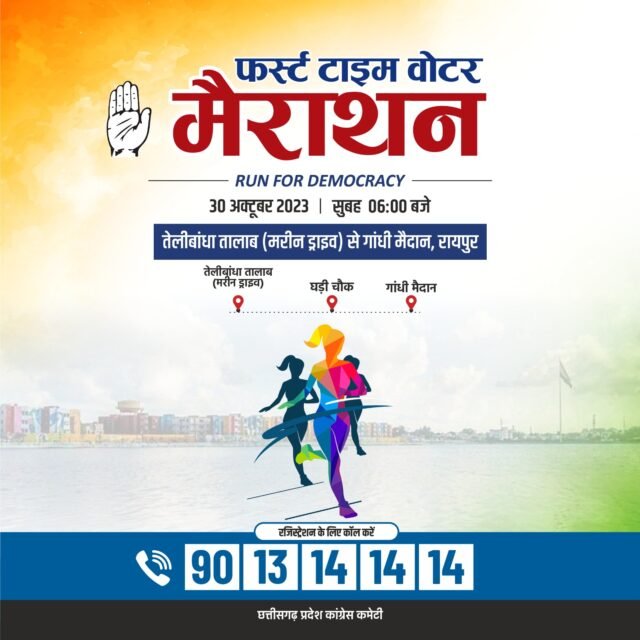 रायपुर : छत्तीसगढ़ के युवा मतदाताओं के लिए प्रदेश कांग्रेस की ओर से मैराथन आयोजन करेगी। साल 2023 में होने वाले चुनाव में पहली बार वोट देने वाले लोगों की संख्या लगभग 18 लाख है। इन्हें प्रेरित करने के लिए इसका आयोजन किया जा रहा है।प्रदेश कांग्रेस पार्टी की ओर से वोटर जागरूकता मैराथन में 18 से 25 साल के युवा भाग ले सकेंगे। इसका आयोजन कल 30 अक्टूबर को किया जाएगा।