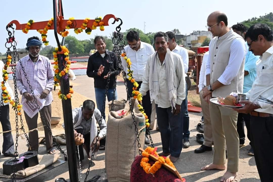 रायपुर : कलेक्टर डॉ. सर्वेश्वर नरेन्द्र भुरे ने आज जिले के मंदिर हसौद स्थित उपार्जन केंद्र में धान खरीदी का पुजा अर्चना कर शुभारंभ किया। आज 01 नवम्बर से धान खरीदी की शुरुआत हुई है। डॉ. भुरे ने केंद्र में आए किसान गणेश राम बंजारे का स्वागत किया। बंजारे ने केंद्र में 30 क्विंटल बेचा।