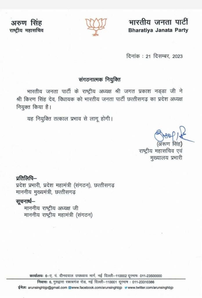 राष्ट्रीय महामंत्री अरुण सिंह ने जारी किया आदेश.