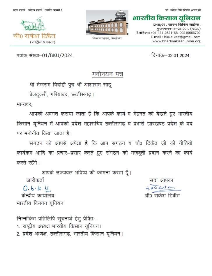 रायपुर: भारतीय किसान यूनियन छत्तीसगढ़ के प्रभारी प्रवीण श्योकंद के अनुशंसा पर राष्ट्रीय प्रवक्ता चौधरी राकेश टिकैत ने छत्तीसगढ़ के जुझारू किसान नेता तेजराम विद्रोही को भारतीय किसान यूनियन छत्तीसगढ़ का महासचिव और झारखंड राज्य का प्रभारी मनोनीत किया है। महासचिव बनाए जाने पर उनके समर्थकों मदन लाल साहू, उत्तम कुमार, ललित कुमार साहू, रेखुराम साहू, नंदू ध्रुव, पवन कुमार साहू, भुनुराम साहू, कृष्णा नरवाल, संजय पंत, मोहन लाल साहू, मनोज कुमार ने हर्ष व्यक्त करते हुए उन्हें बधाई व शुभकामनाएं प्रेषित किया है। महासचिव मनोनीत होने पर तेजराम विद्रोही ने कहा कि वह हमेशा मेहनतकश वर्ग के शोषण दमन उत्तपीड़न के विरुद्ध उनके वाजिब अधिकारों को दिलाने संघर्ष करते आये हैं और आगे भी जारी रहेगी। राकेश टिकैत जी ने जो जिम्मेदारी सौंपी है उसे पूरी लगन के साथ निभाएंगे और जनता के पक्ष में सदा खड़ा रहेंगे।