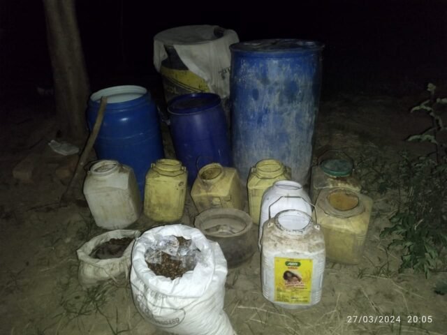 आरंग: हीरा नार नाला चिखली महानदी के किनारे थाना आरंग को मुखबिर के जरिए से जानकारी प्राप्त हुई कि ग्राम चिखली महानदी के किनारे कुछ अज्ञात लोग महुआ से अवैध शराब बना रहे हैं की सूचना पर मुखबिर के बताएं स्थान महानदी की ओर रवाना हुआ वहां गवाह के साथ मुखबिर के बताए जगह में जाकर घेराबंदी कर अवैध महुआ शराब की रेड की कार्यवाही के लिए जैसे ही घटनास्थल हीरा नार नाला की ओर बढ़े ,पुलिस को आते देख अवैध रूप से शराब बनाने वाले अज्ञात व्यक्ति तीन चार लोग देखकर घटनास्थल से भाग गए घटना स्तर पर जाकर देखें तो काफी मात्रा में महुआ ,महुआ से बना पास एवं अवैध शराब बनाने वाली सामग्री हांडी स्टील और मिट्टी के बर्तन शराब रखने का पीला एवं सफेद रंग के डालडा वाला डब्बा करीबन 9 नग नीला रंग का बड़ा जरकिन साथ 70 लीटर वाला 3 नग एवं 60 लीटर वाला 3नग ,तीन बड़ा ड्रम नीले रंग का 250 लीटर का जिसमें अलग-अलग महुआ शराब मात्रा करीबन 1365 बल्क लीटर महुआ शराब अवैध रूप से बनाते मिला जिसे जप्त किया गया।1365 बल्क लीटर महुआ शराब की कीमत 204750 रुपएमहुआ पास 150 किलो कीमती 6750 एवं 70 किलो कच्चा महुआ कीमत 6300 कुल जुमला 217800 रुपए गवाहों के समक्ष जप्त कर कब्जा पुलिस लिया गया।