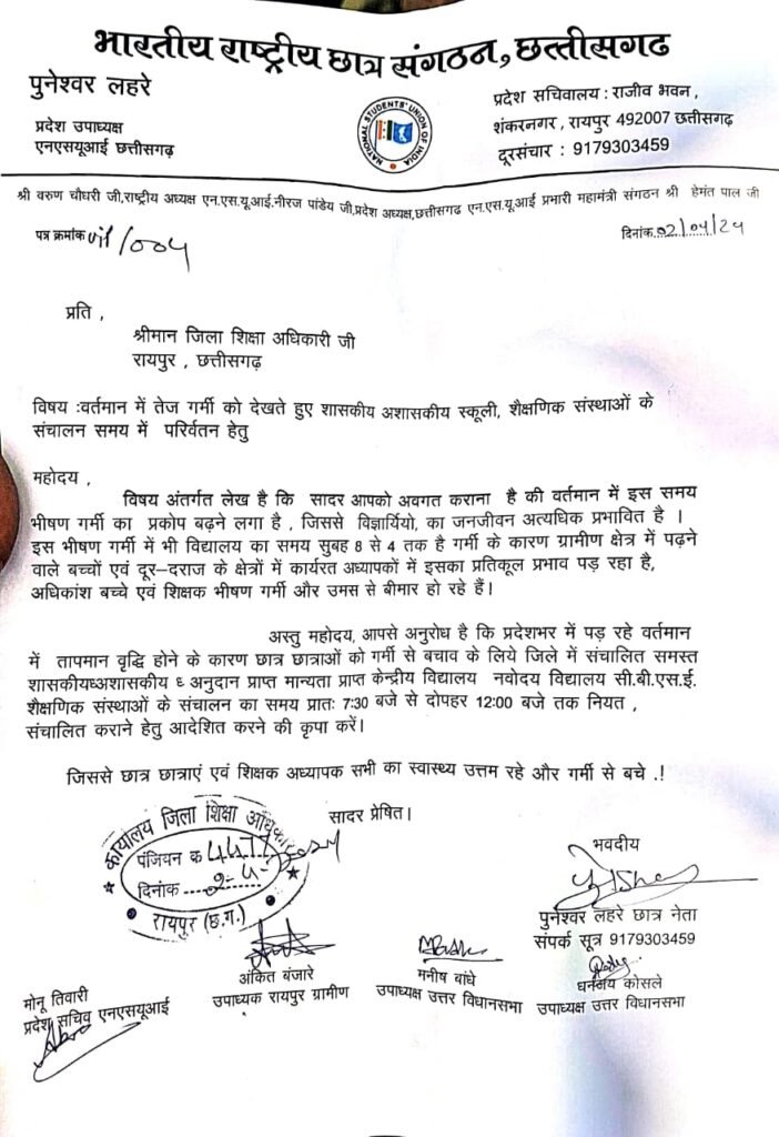 लहरे ने कहा हर साल जिला शिक्षा अधिकारी की लापरवाही को अवगत कराना पड़ता है की गर्मी में इस समय बच्चे बजुर्ग सभी परेशान है ऐसे में विद्यालय का समय सुबह 8 से 4 तक है ,गर्मी के कारण ग्रामीण क्षेत्र में पढ़ने वाले बच्चों एवं दूर-दराज के क्षेत्रों में कार्यरत अध्यापकों में इसका प्रतिकूल प्रभाव पड़ रहा है, अधिकांश बच्चे एवं शिक्षक भीषण गर्मी और उमस से बीमार हो रहे हैं। प्रदेशभर में पड़ रहे वर्तमान में तापमान वृद्धि होने के कारण छात्र/छात्राओं को गर्मी से बचाव के लिये जिले में संचालित समस्त शासकीय/अशासकीय / अनुदान प्राप्त / मान्यता प्राप्त / केन्द्रीय विद्यालय / नवोदय विद्यालय/सी.बी.एस.ई. शैक्षणिक संस्थाओं के संचालन का समय प्रातः 7:30 बजे से दोपहर 12:00 बजे तक नियत , संचालित कराने हेतु आदेशित करने के लिए ज्ञापन दिया है जिला शिक्षा अधिकारी द्वारा 1 से 2 दिन में कार्रवाई नहीं किया जाता है स्कूल शिक्षा मंत्री से मिलकर ज्ञापन सौंप लापरवाही से अवगतकराया जाएगा ।इस मौके पर अभिषेक तिवारी प्रदेश सचिव , विधानसभा उपाध्यक्ष मनीष बांधे , अंकित बंजारे, धनंजय कोशले, हिमांशु तांडी, आलोक खरे आदि एनएसयूआई पदाधिकारी मौजूद थे।