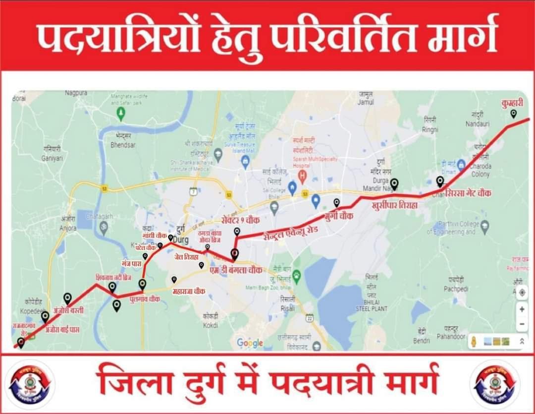सड़क पर वाहन पार्क ना करें।कुम्हारी से डोगरगढ़ तक वाहनों का रूट निर्धारित किया गया है अतः निर्धारित डायवर्सन मार्ग का प्रयोग करें।