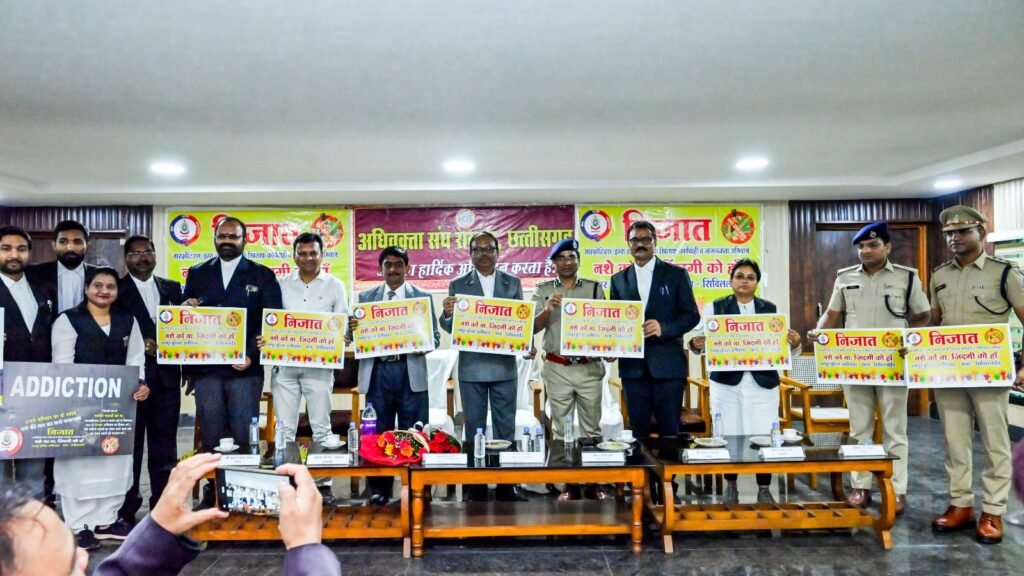 न्यूज डेस्क रायपुर : जिला अधिवक्ता संघ रायपुर के जिला अध्यक्ष हितेंद्र तिवारी ने कहा अधिवक्ता संघ के द्वारा आज जिला न्यायालय परिसर स्थित कक्ष क्रमांक 210 में पुलिस के द्वारा नशे के विरुद्ध चलाए जा रहे निजात कार्यक्रम”नशे को ना जिंदगी को हां” का कार्यक्रम आयोजित किया गया जिसमें जिला न्यायाधीश, न्यायाधीशगण, एसएसपी सहित सैकड़ो अधिवक्तागणों की उपस्थिति में संपन हुआ। निजात कार्यक्रम के मुख्य अतिथि जिला एवं सत्र न्यायाधीश श्री अब्दुल जाहिद कुरैशी, कार्यक्रम की अध्यक्षता वरिष्ठ पुलिस अधीक्षक श्री संतोष कुमार सिंह, विशिष्ट अतिथि प्रधान न्यायाधीश कुटुंब न्यायालय हेमंत सराफ ने किया। कार्यक्रम को संबोधित करते हुए जिला एवं सत्र न्यायाधीश अब्दुल जाहिद कुरैशी ने कहा नशे के खिलाफ सिर्फ पुलिस को पुलिस ही नहीं बल्कि हर वर्ग को समाने आकर एकजुट होना चाहिए उन्होंने कहा परिवार और समाज के लिए सबसे ज्यादा अगर कोई घातक है तो वह नशा है, उन्होंने नशे के बढ़ते प्रभाव पर प्रकाश डालते हुए कहा न्यायालय में भी नशे से संबंधित प्रकरणों की भरमार हो गई, एनडीपीएस की केस बढ़ रही है, उन्होंने कहा नशा करने से सिर्फ एक व्यक्ति प्रभावित नहीं होता बल्कि उससे जुड़े हर लोग होते हैं चाहे वह उसका परिवार हो या समाज हो।