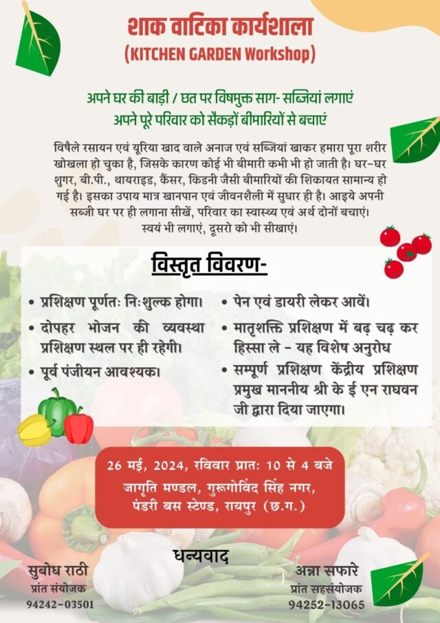 रायपुर : पंडरी बस स्टैंड स्थित जागृति मंडल में शाक वाटिका कार्यशाला का आयोजन रविवार को किया गया है। कार्यशाला का आयोजन सुबह 10 से शाम 4 बजे तक किया जाएगा। जिसमें घर की बाड़ी, छत पर विषमुक्त साग-सब्जियांे को लगाने व परिवार को सैकड़ों बीमारियों से बचाने के बारे में जानकारी दी जाएगी। यह प्रशिक्षण निशुल्क होगा और पूर्व पंजीयन आवश्यक है। केंद्रीय प्रशिक्षण प्रमुख श्री के ई एन राघवन जी के द्वारा प्रशिक्षण दिया जाएगा। यह आयोजन गौ सेवा गतिविधि के दवारा आयोजित की गई है। प्रशिक्षण प्राप्त करने के लिए मो. नम्बर 94252-13065 में नाम, पते और मोबाइल नंबर भेजकर पंजीयन करा सकते है।