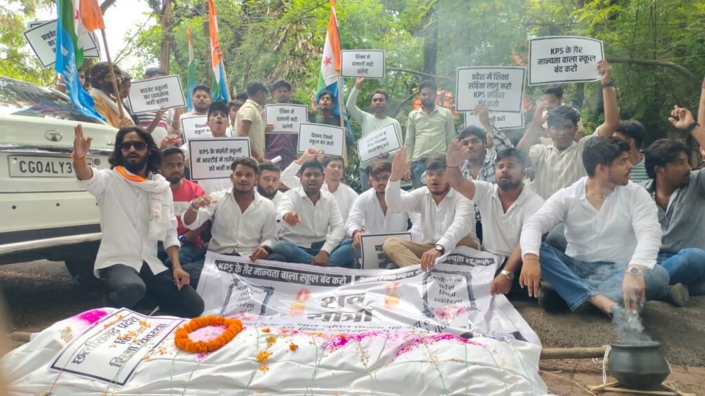ये है पूरा मामला एनएसयूआई का कहना है लगातार राजधानी में गैर मान्यता स्कूल चल रहे है KPS के ज्यादातर स्कूलों के पास मान्यता नहीं है। रायपुर में बड़ी संख्या में ऐसे प्ले स्कूल भी चलाए जा रहे हैं, जिनकी न तो मान्यता है और न ही दिशा निर्देशों के अनुसार उन स्कूलों का संचालन हो रहा है।जिला शिक्षा अधिकारी पर संरक्षण का आरोपNSUI का आरोप है कि, स्कूलों में चल रही इस धांधली को रायपुर के जिला शिक्षा अधिकारी विजय खंडेलवाल संरक्षण दे रहे हैं। उनके ही इशारे पर इन स्कूलों के खिलाफ कोई एक्शन नहीं हो रहा है। ये बच्चों के भविष्य के साथ खिलवाड़ है।राजधानी रायपुर के गली-मोहल्लों में चल रहे निजी स्कूलों की मान्यता को लेकर जिला शिक्षा अधिकारी को शिकायत मिली थी। जांच के बाद पता चला कि 16 में से सिर्फ 2 स्कूलों को ही मान्यता मिली हुई है। बाकी अन्य के पास मान्यता नहीं है।जिसके बाद से ही NSUI ने प्रदर्शन कर गैर मान्यता प्राप्त स्कूलों के खिलाफ कार्रवाई की मांग की थी। लगभग महीने भर पहले बिना मान्यता के संचालित होने वाले चैतन्य टेक्नो स्कूल की अमलीडीह ब्रांच को जिला शिक्षा अधिकारी ने सील किया था।मान्यता के बिना छात्रों को एडमिशन देने के कारण स्कूल की दो ब्रांच पर 1-1 लाख रुपए का जुर्माना किया गया है। लेकिन निजी प्रबंधन के स्कूलों पर कार्रवाई नहीं होने पर NSUI लगातार जिला शिक्षा अधिकारी से कार्रवाई की मांग कर रहा है।