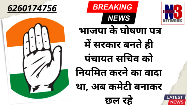 रायपुर :प्रदेश कांग्रेस कमेटी के वरिष्ठ प्रवक्ता धनंजय सिंह ठाकुर ने भाजपा सरकार के द्वारा पंचायत सचिवों के संविलियन के लिए बनाई गई कमेटी पर तंज करते हुए कहा कि भाजपा ने अपने घोषणा पत्र में मोदी की गारंटी के नाम से सरकार बनते ही पंचायत सचिवों को नियमित करने का वादा किया था, यहां तो उलटी गंगा बह रही है नियमितकरण के आदेश के बजाये कमेटी बनाया जा रहा है। कमेटी बनाकर पंचायत सचिव को ठगा जा रहा हैं। भाजपा का यह असल चरित्र है चुनाव के दौरान वादा करना और सत्ता मिलते ही वादा खिलाफी करना।