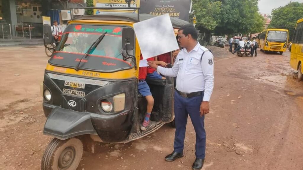 यह कार्यवाही जिले के सभी स्कूलो में परिवहन करने वाले ऑटा/वैन तथा स्कूल बसो पर भी की जावेगी। जितेन्द्र शुक्ला, पुलिस अधीक्षक दुर्ग के निर्देश पर तथा सतीष ठाकुर,, सदानंद विंदयराज उप पुलिस अधीक्षक, यातायात, के नेतृत्व में आज लगातार यातायात के अधिकारी द्वारा स्कूलो में निजी वाहन से स्कूली बच्चों का परिवहन करने वाले ऑटो/वैन की चेंकिग की गई जिसमे 08 वाहनो में परमिट, फिटनेश, बीमा एवं बिना लायसेंस के मोटर व्हीकल एक्ट की धाराओं के तहत कार्यवाही करते हुए 6500 रूपये समन शुल्क वसूल किया गया साथ ही इन वाहन चालको को सुरक्षा मानको को पूर्ण करने ओवर लोड बच्चो का परिवहन न करने तथा वाहन के संपूर्ण कागजात पूर्ण रखने कहा गया।