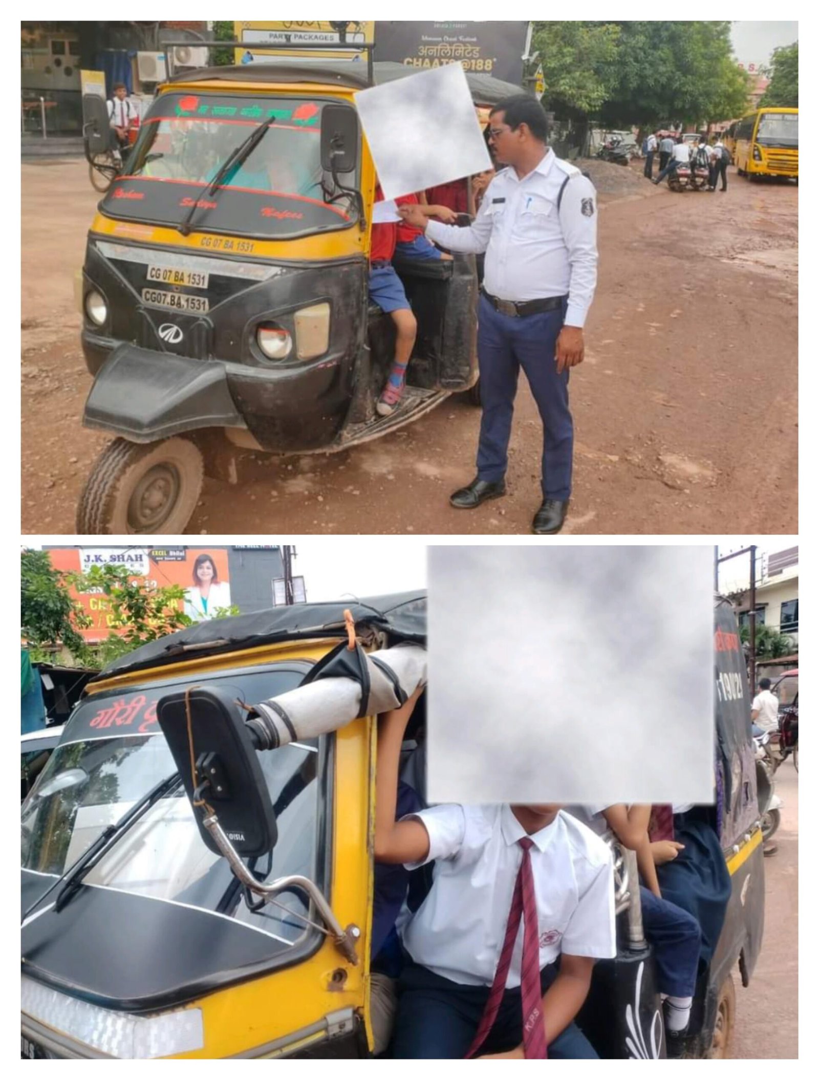 यातायात पुलिस द्वारा नियम का अव्हेलना कर स्कूली बच्चो को परिवहन करने वाले ऑटो/वैन पर की गई कार्यवाही।