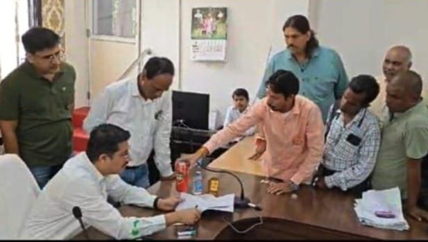 जनसुनवाई में कलेक्टर के समक्षहाथों में शराब के क्वार्टर लेकर पहुंच गए शिवसेना नेता