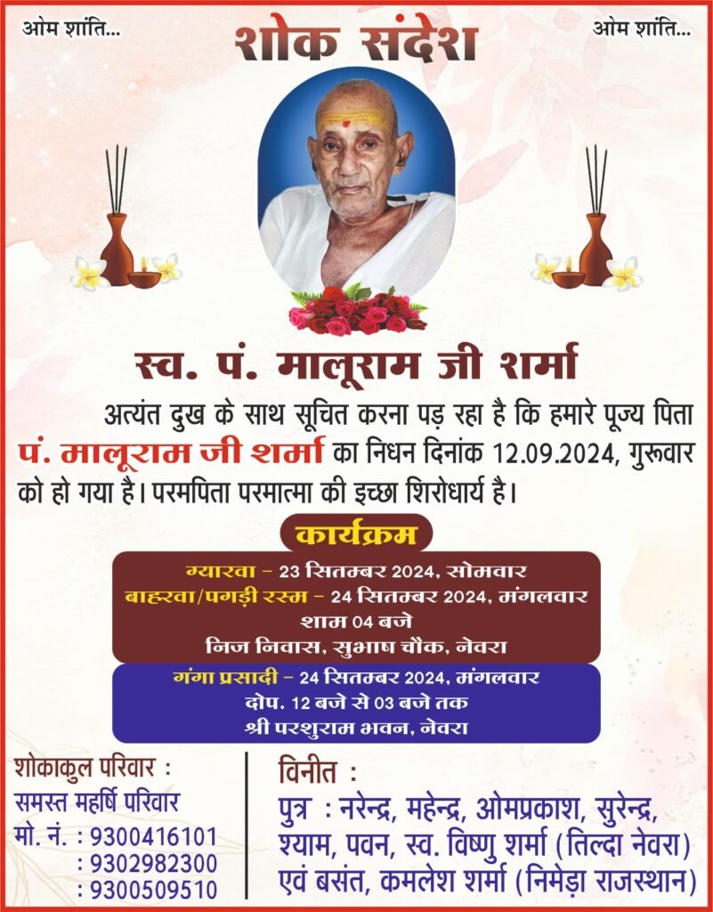 तिल्दा नेवरा: अखिल भारतीय ब्राह्मण समाज तिल्दा नेवरा के प्रेरणास्रोत संरक्षक, राष्ट्रीय स्वयंसेवक संघ, वरिष्ठ जनसंघी, सरस्वती शिशु मंदिर तिल्दा नेवरा के प्रथम व्यवस्थापक, मीसाबंदी वरिष्ठ पत्रकार पंडित मालूराम जी शर्मा उम्र 86 हम सब के बीच नहीं रहे, बिते 12 सितंबर को प्रभु श्रीचरणों में उनका देवलोक गमन हो गया।स्वर्गीय पंडित मालूराम शर्मा आपात काल में करीब 19 महीना जेल में थे। उन्होंने जब तक जीवन जिया सादगी पूर्ण तरीके से समाज एवं राजनीति जीवन में संगठन को लेकर कार्य किया। बाल्य काल उम्र से ही अपने जीवन में अनेक अभावों में अपने परिवार को एकजुट तो किया ही बच्चो में भी हिम्मत दी।