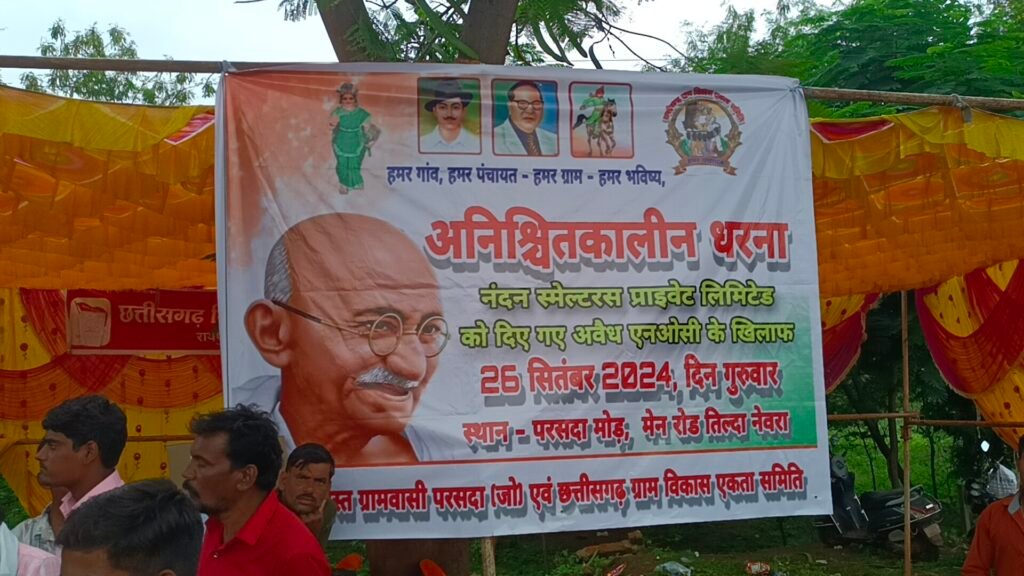 नंदन स्मेल्टरस प्राइवेट लिमिटेड को दिए गए अवैध एन ओ सी के खिलाफ आज 26 सितंबर 2024 को परसदा मोड़ मुख्य सड़क मार्ग सिमगा सासाहोली तिल्दा पर ग्राम पंचायत परसदा के ग्रामीण जन अनिश्चितकालीन धरने पर बैठे ग्रामीणों ने तत्काल प्लांट की NOC को रद्द कर निर्माण कार्य पर रोक लगाने की मांग किए भारी संख्या में ग्रामीण घंटो से मुख्य सड़क मार्ग पर चक्का जाम कर के बैठे हुए थे जिससे राहगीरों को तकलीफों का सामना करना पड़ मौके पर भारी संख्या में पुलिस बल और तहसीलदार तिल्दा मौजूद रहे।