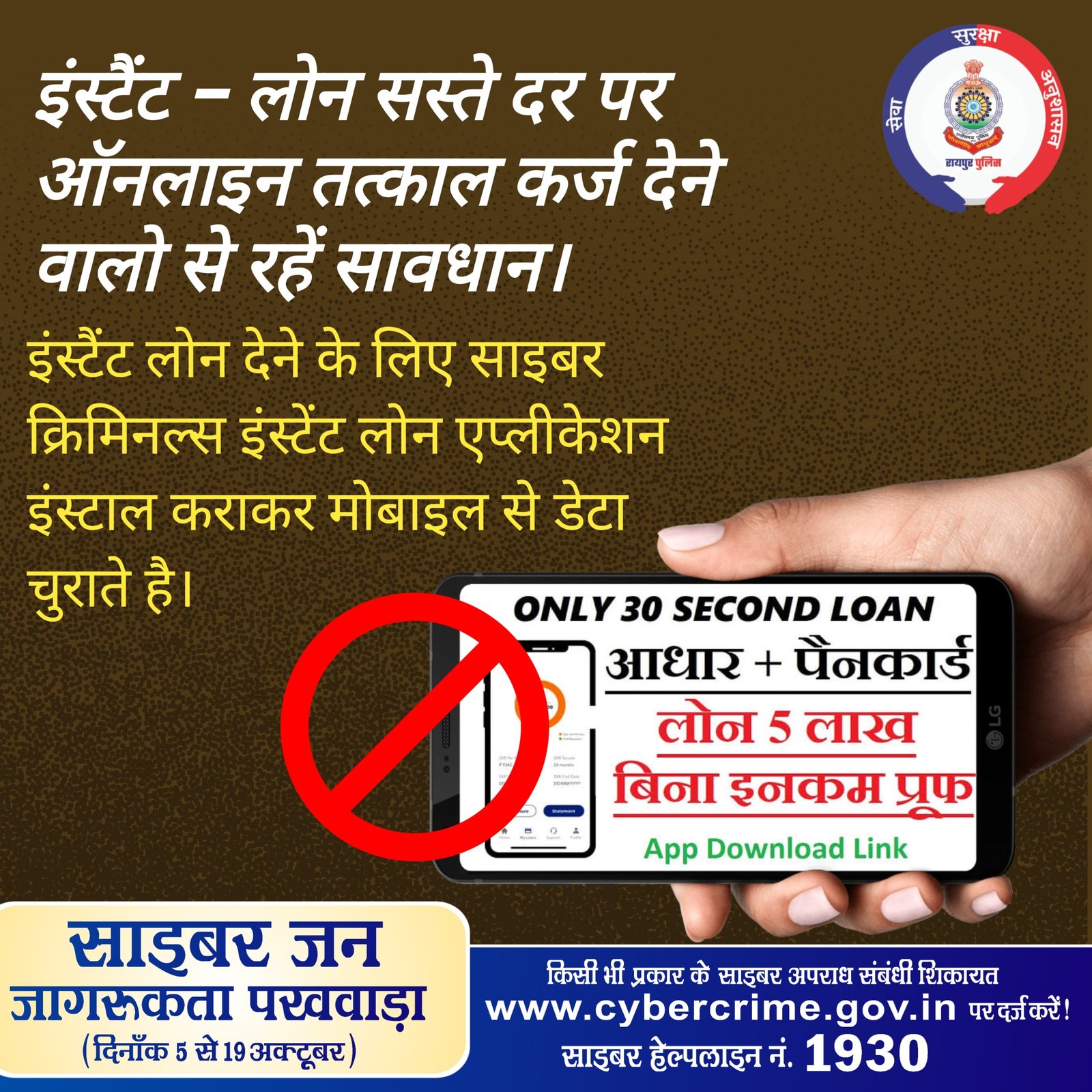 क्या करें ग्राहकों को लोन लेने के लिए सुरक्षित ,अधिकृत फाइनेंसियल बॉडीज का चुनाव करना चाहिए ,जो आर बी आई से पंजीकृत हो ,किसी भी अनजान ऍप्लिकेसन के माध्यम से लोन लेना घातक हो सकता है ,ऐसी किसी भी प्रकार की घटना होने पर नजदीकी पुलिस थाने अथवा साइबर सेल से संपर्क करें। अगर ठगी का शिकार हो गए हों तो क्या करें 1930 पर डायल करें ,www.cybercrime.gov.in पर लॉगिन कर रिपोर्ट करें,नजदीकी थाने अथवा साइबर सेल से संपर्क करें सावधान रहें ,सुरक्षित रहें रोहित मालेकरनिरीक्षक थाना प्रभारी सिविल लाइनरायपुर