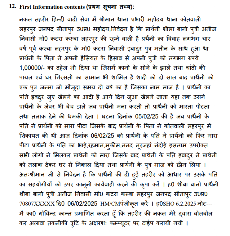 न्यूज डेस्क उत्तर प्रदेश सीतापुर: जुआ खेलने से मना करने पर पति ने दिया तलाक सीतापुर के लहरपुर थाना क्षेत्र में जुआ खेलने से रोकने पर पति ने पत्नी को बेरहमी से पीटा और तलाक दे दिया।पीड़िता ने आरोप लगाया कि पति ने दो साल के मासूम को भी छीन लिया। शिकायत के बाद पुलिस ने मामला दर्ज कर जांच शुरू कर दी है।